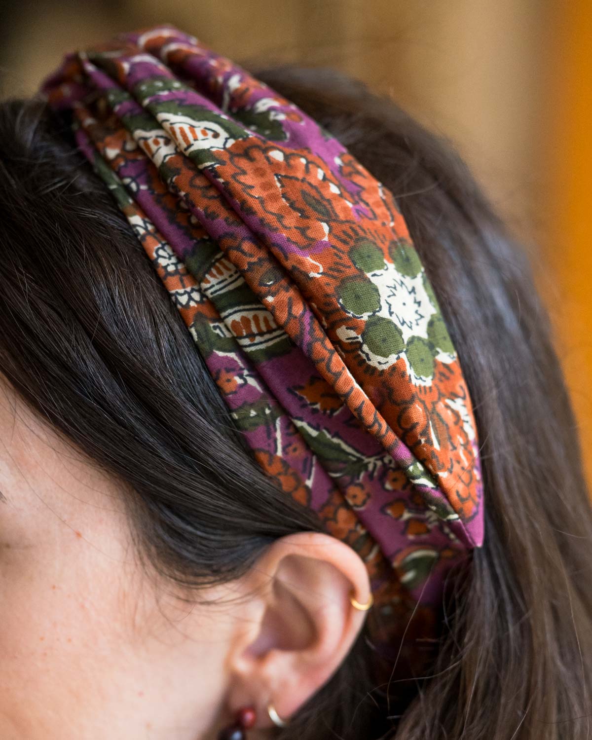 De Varja haarband is een handgemaakt accessoire uit het atelier van La La Bella. Gemaakt van zacht katoen in een diepe paarse tint, met speelse oranje, witte en groene blockprint accenten. Deze haarband is licht en comfortabel en kan dankzij het ijzerdraad gemakkelijk in model gebracht worden.