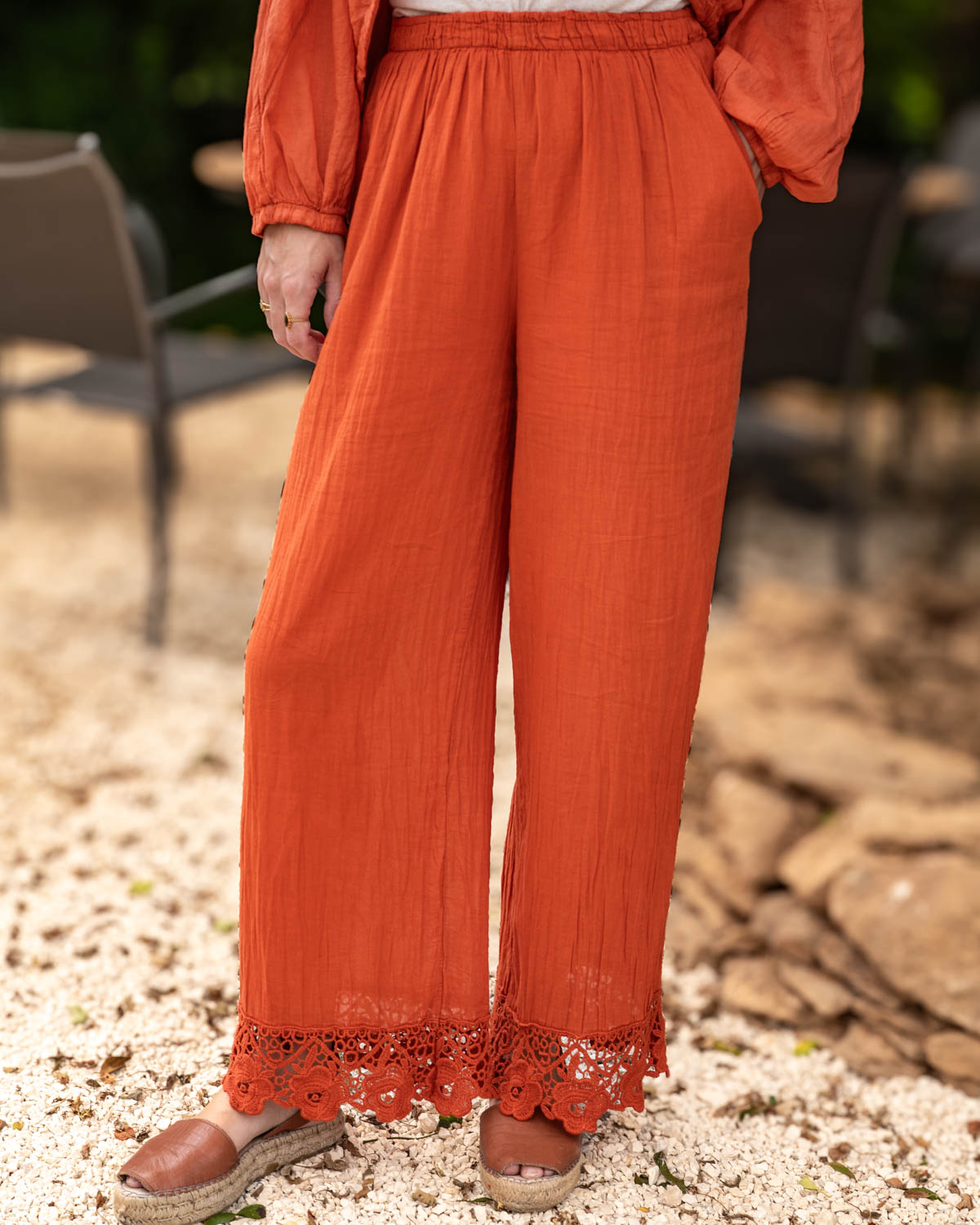 Boho Katoenen Broek “Aya” – Oranje Terracotta – Garçonne – Gehaakte Rand