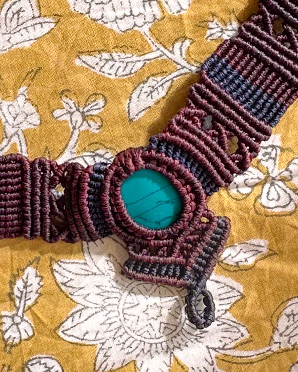 • Macramé ketting Nova – handgemaakte boho ketting bordeaux-donkerblauw met aquakleurige steen