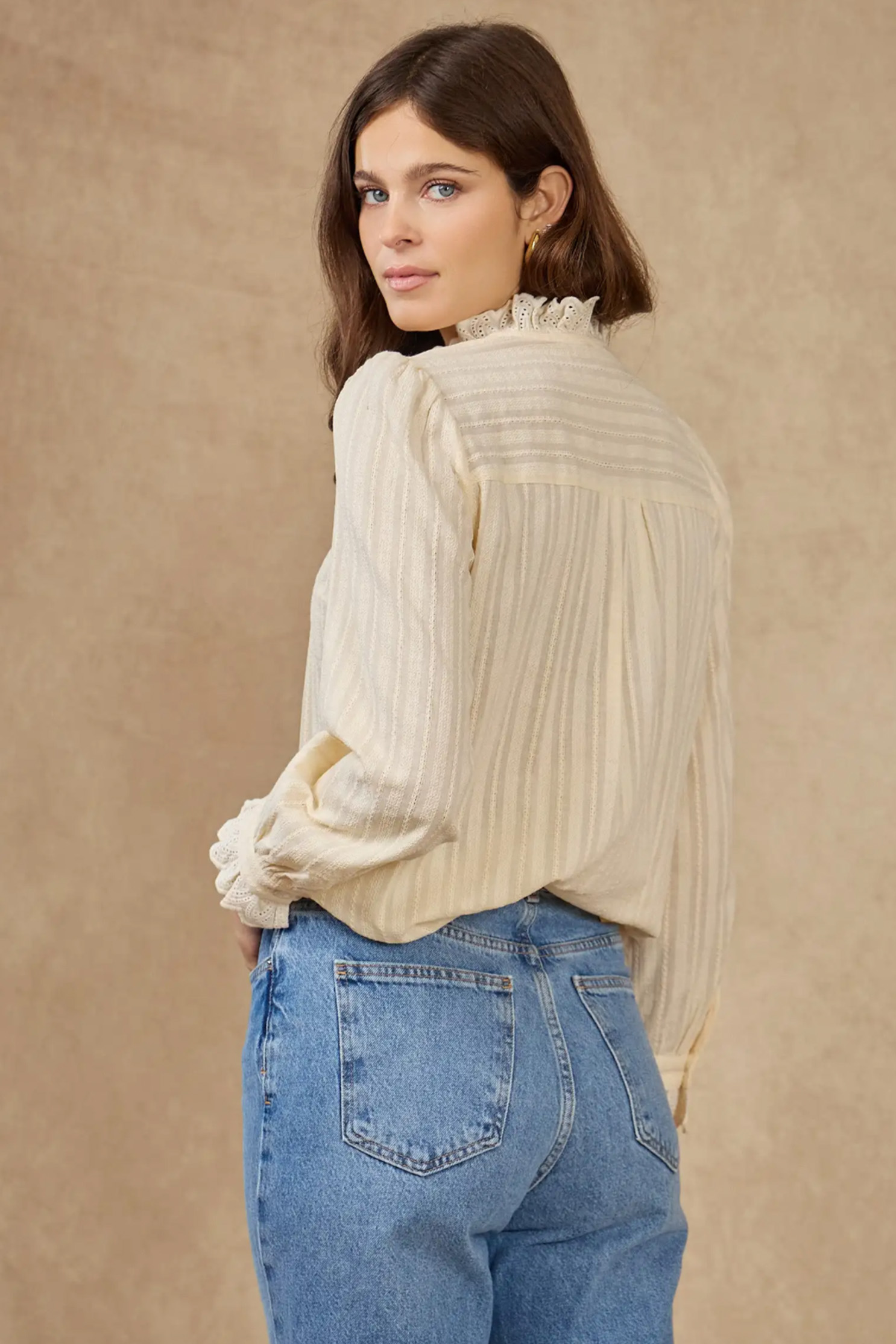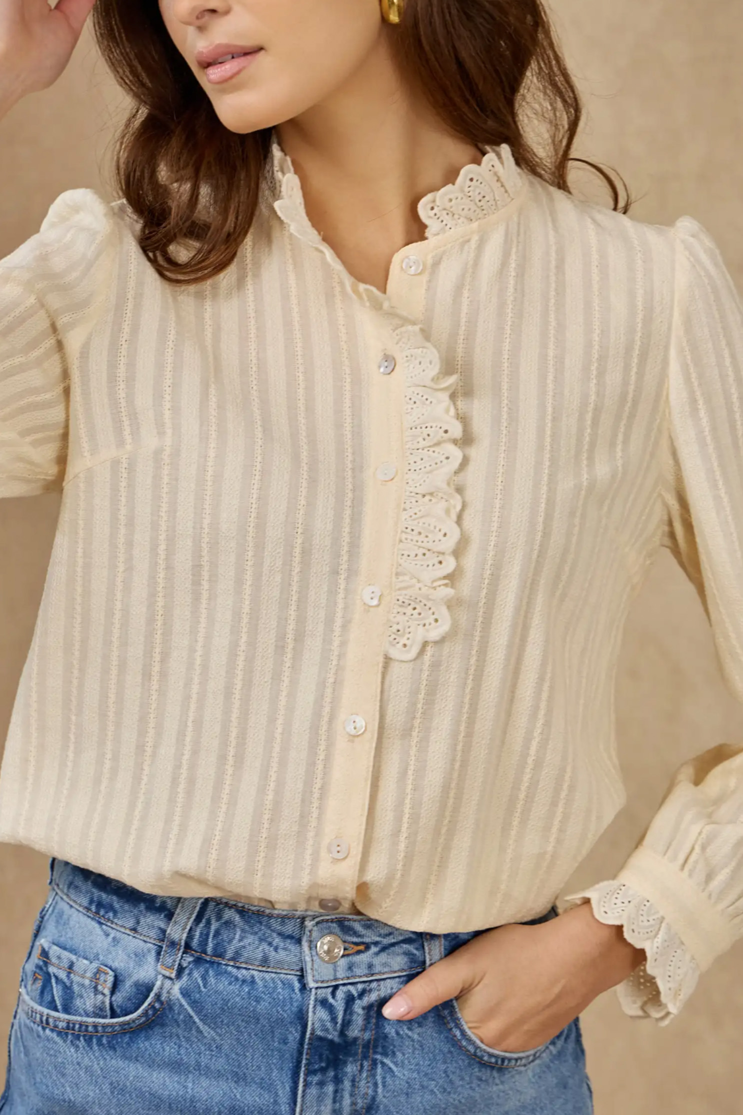 De Soline blouse is een elegante beige katoenen blouse met lange mouwen en een high neck van broderie anglaise. De subtiele gestreepte structuur in de stof geeft de blouse een speelse textuur.