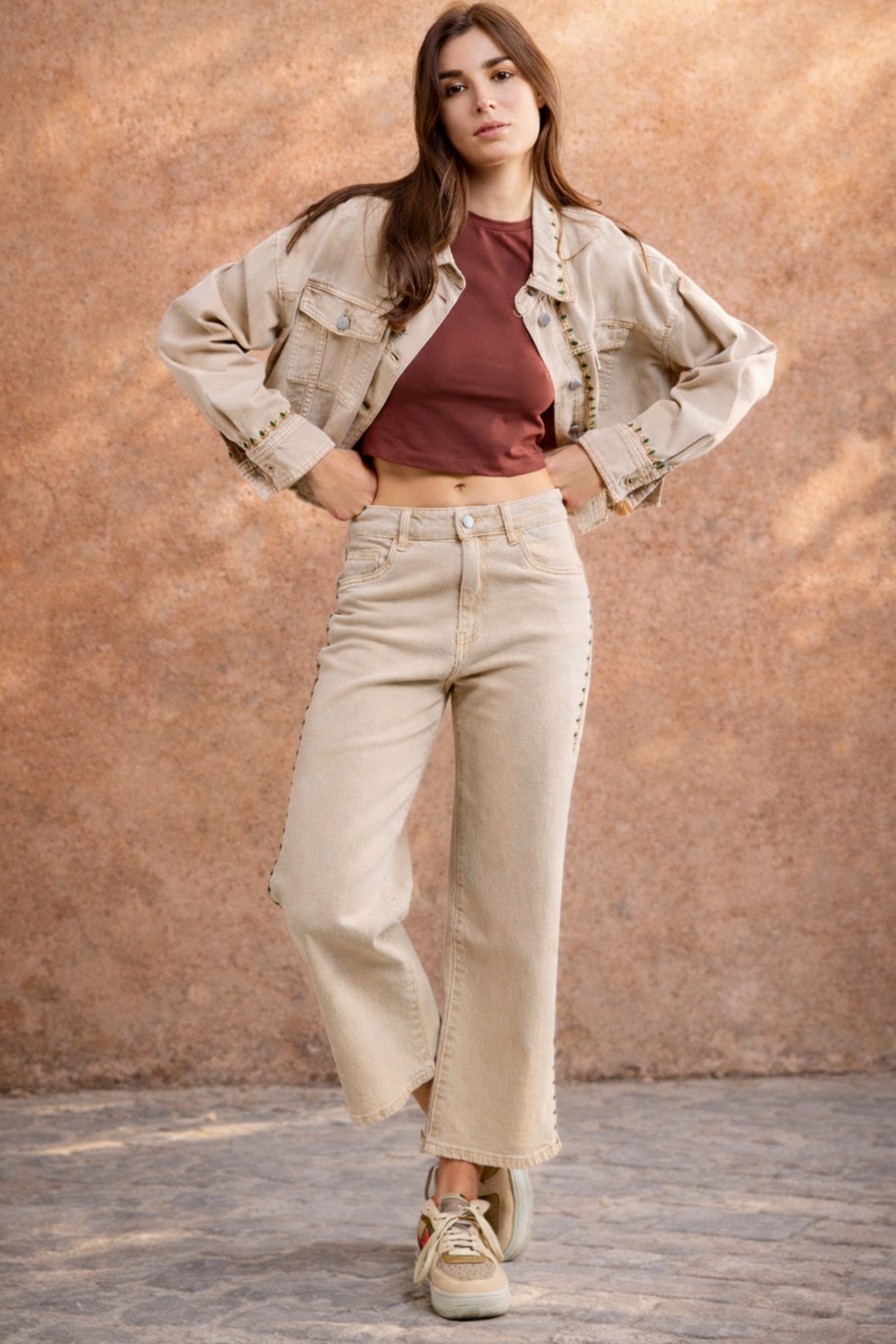 Beige katoenen broek Amira – 3/4 lengte met borduursels