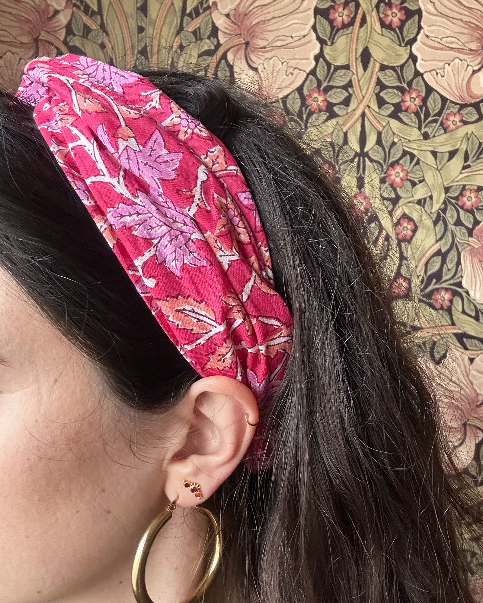 Haarband Lena is een boho haarband van katoen met een prachtige fuchsia blockprint. De print en tinten maken deze haarband perfect voor het voorjaar.