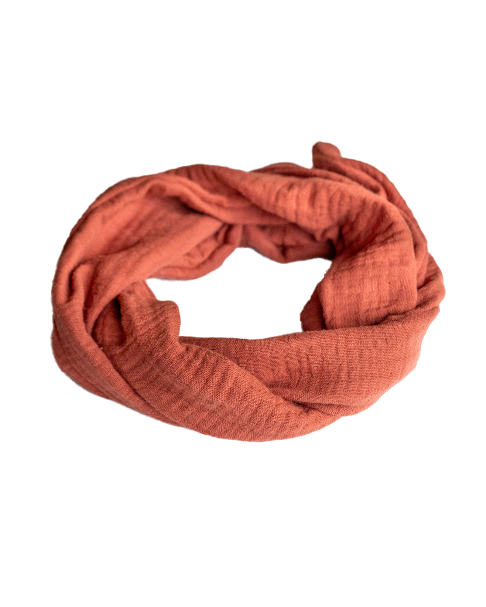 De Xelly haarband is een handgemaakt accessoire uit het atelier van La La Bella. Gemaakt van zacht hydrofiel katoen in een warme terraroze tint, en voorzien van verwerkt ijzerdraad waarmee je de band gemakkelijk in model brengt en stevig draagt.