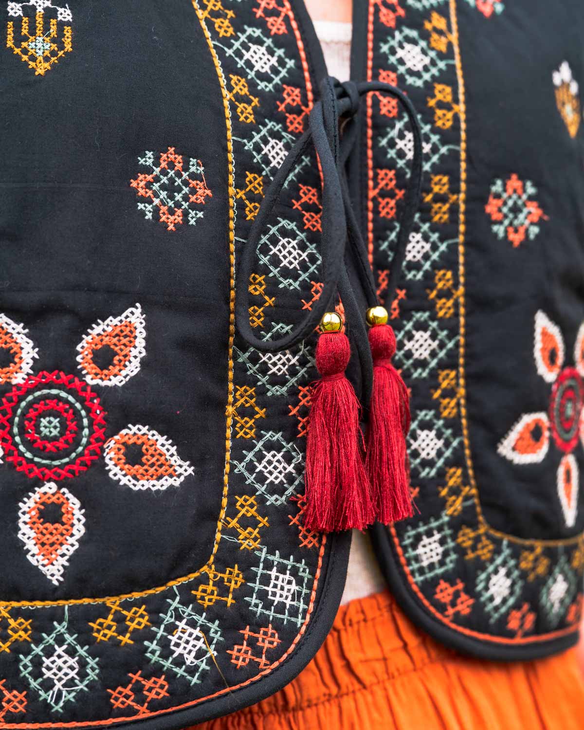 Voeg een unieke bohemian touch toe aan je outfit met deze handgemaakte zwarte waistcoat. Waistcoat Zahra is gemaakt van stevig, hoogwaardig katoen en is rijkelijk afgewerkt met kleurrijke borduursels en sierlijke kwastjes. De zachte vulling geeft de bodywarmer een comfortabele, gewatteerde structuur — ideaal om een basic outfit direct boho-chic te maken.