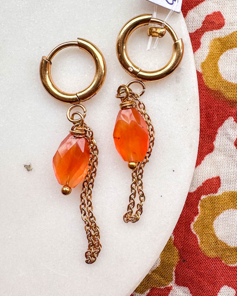 De handgemaakte oorbellen zijn van stainless steel en afgewerkt met kleine carneool edelstenen en een klein kettinkje.