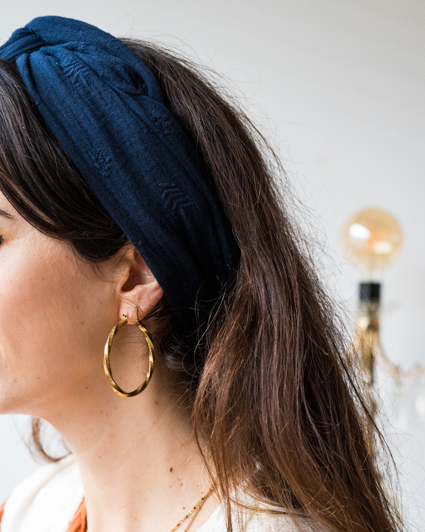 Deze hydrofiele broderie haarband is gemaakt van 100% katoen. De donkerblauwe kleur is perfect voor dit najaar! Hij is ook verkrijgbaar in het camel!
