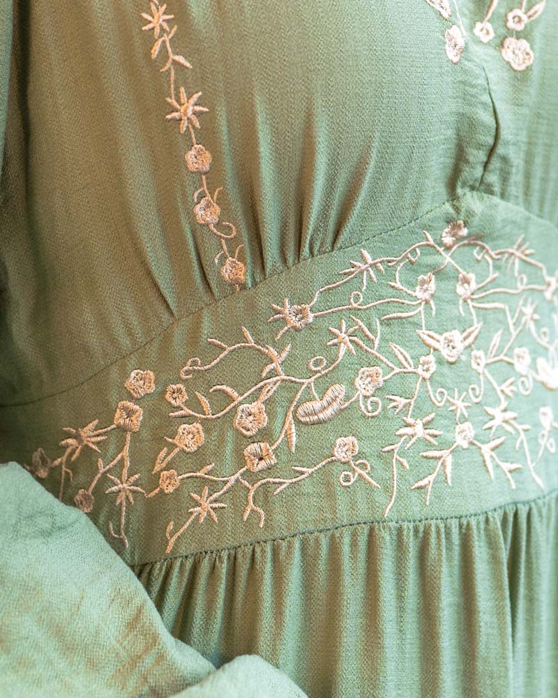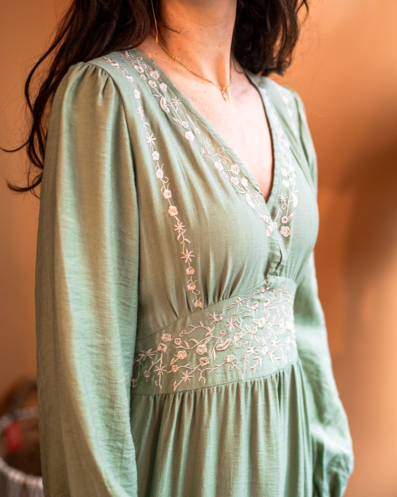 Het fijne witte borduursel geeft de jurk een authentieke, bohemian uitstraling. De natuurlijke groene tint straalt rust en warmte uit en maakt deze jurk perfect voor zowel overdag als ‘s avonds.