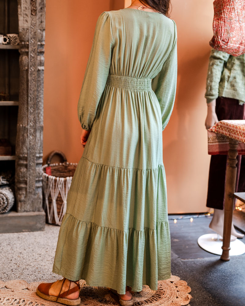Lange Groene Boho Jurk – “Sierra” – Met Bruin Borduursel – Viscose