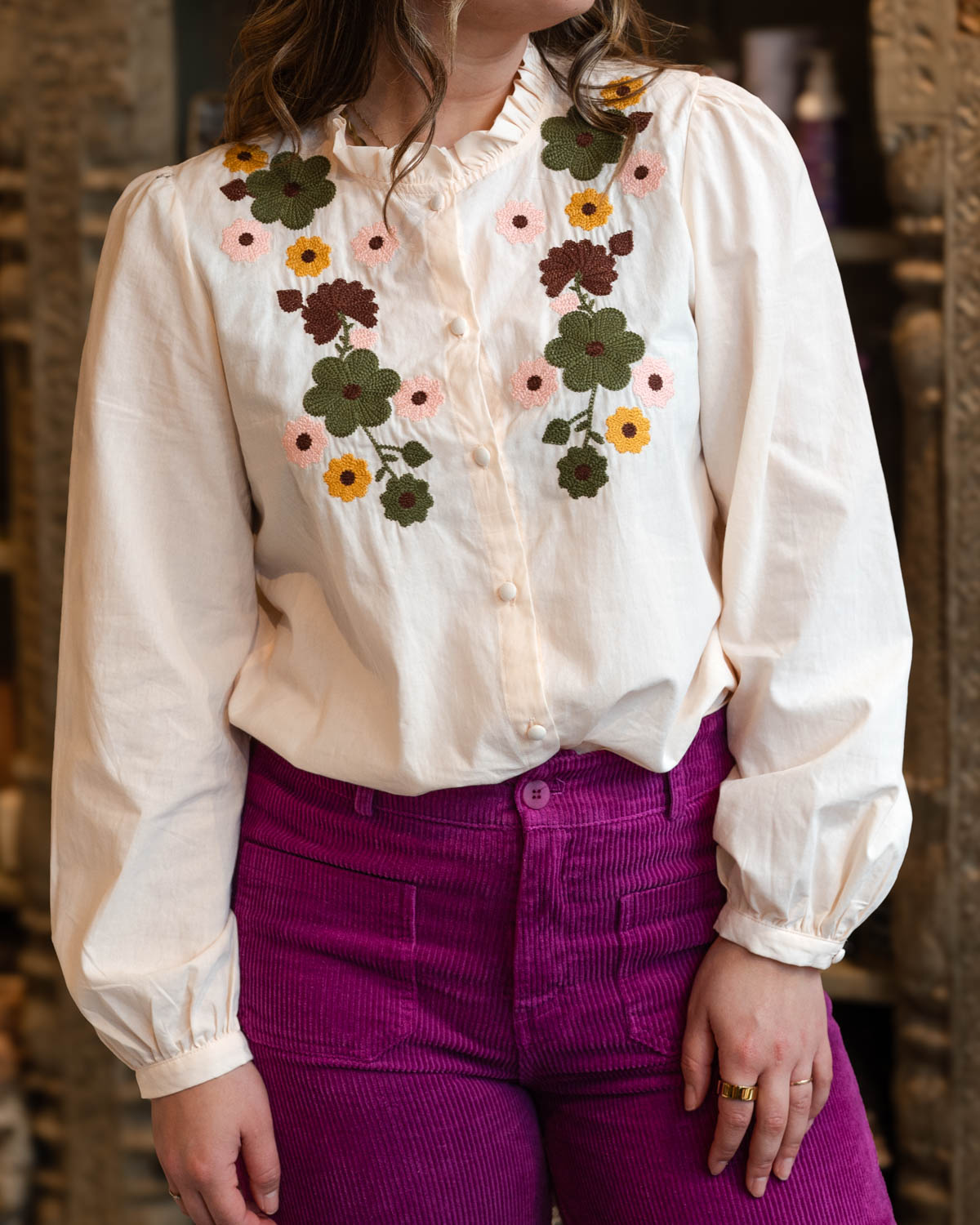 De Camille blouse is gemaakt van zacht katoen. De blouse heeft een elegant geschulpte kraag en is aan de voorkant voorzien van subtiel geborduurde, gekleurde bloemen.