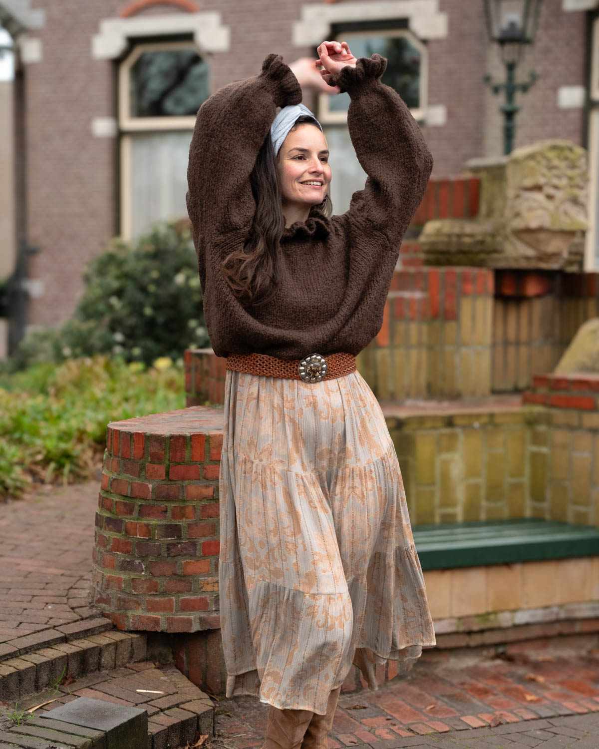 De Selene jurk is een echte eyecatcher met een zacht en verfijnd kleurenpalet van lichtgrijs, taupe en hazelnoot. De subtiele lurex draad zorgt voor een lichte glans en geeft de jurk een elegante, feestelijke uitstraling zonder te overheersen.