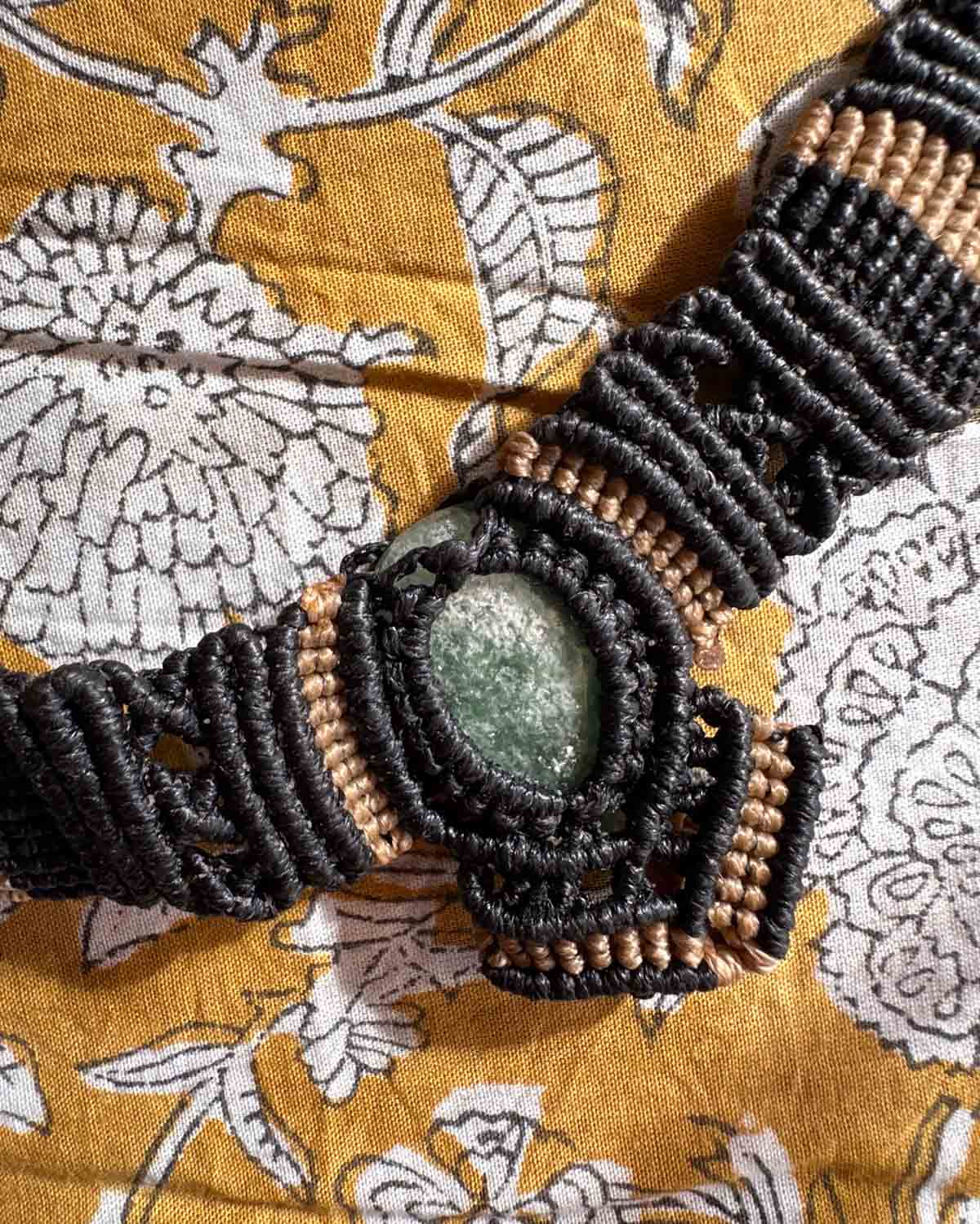 Kleur: zwart/grijs/beige draden met groene steen