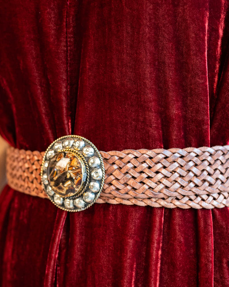 Handgemaakte leren heuptas Althea – voorkant met steen en klinknagels