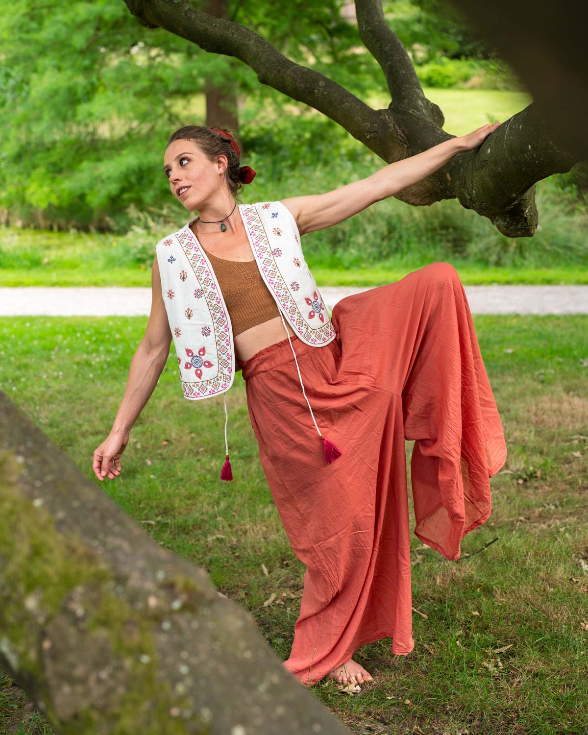 Bohemian damesbroek van katoen in oranje-roze met wijde pijpen – Solène van Garçonne