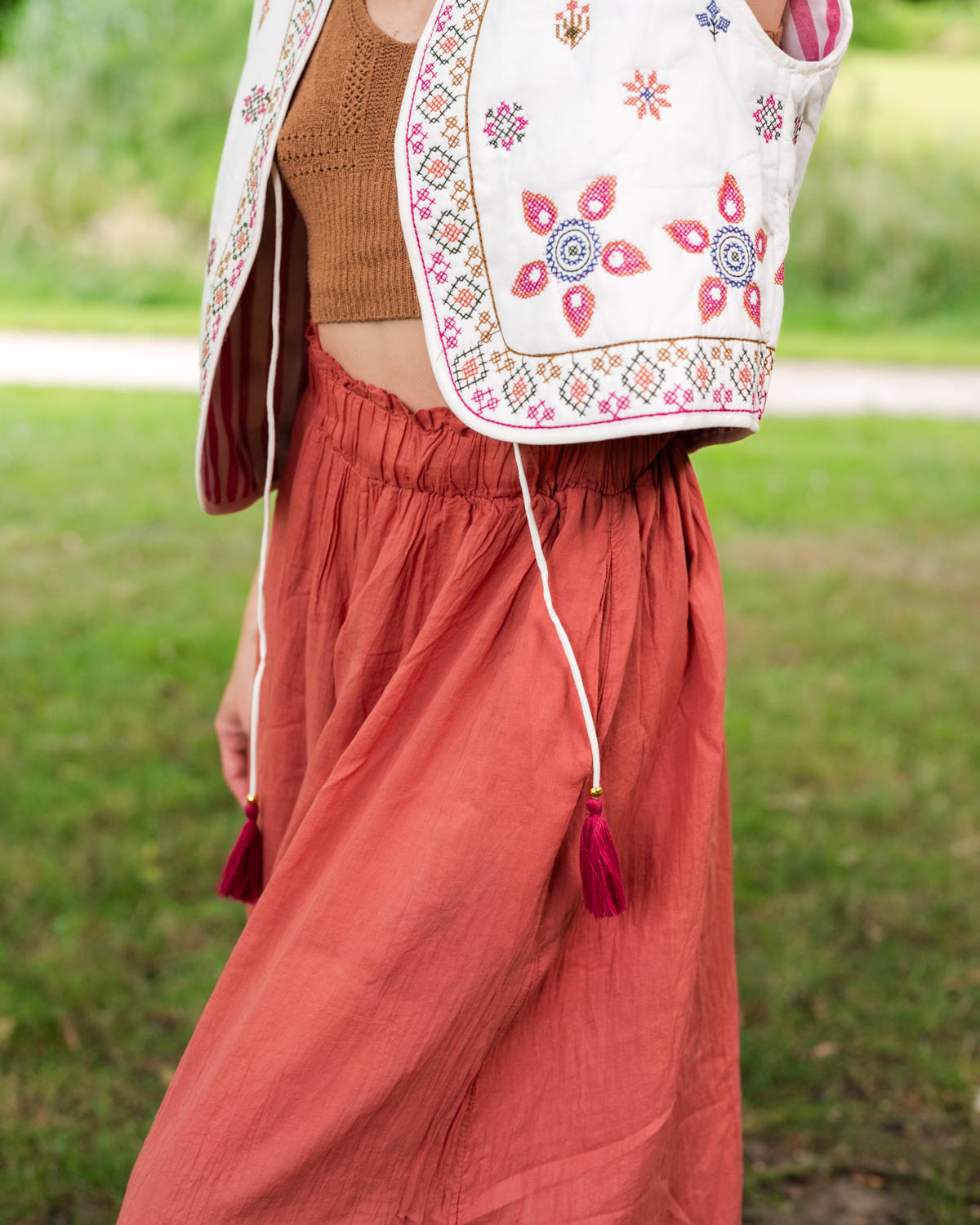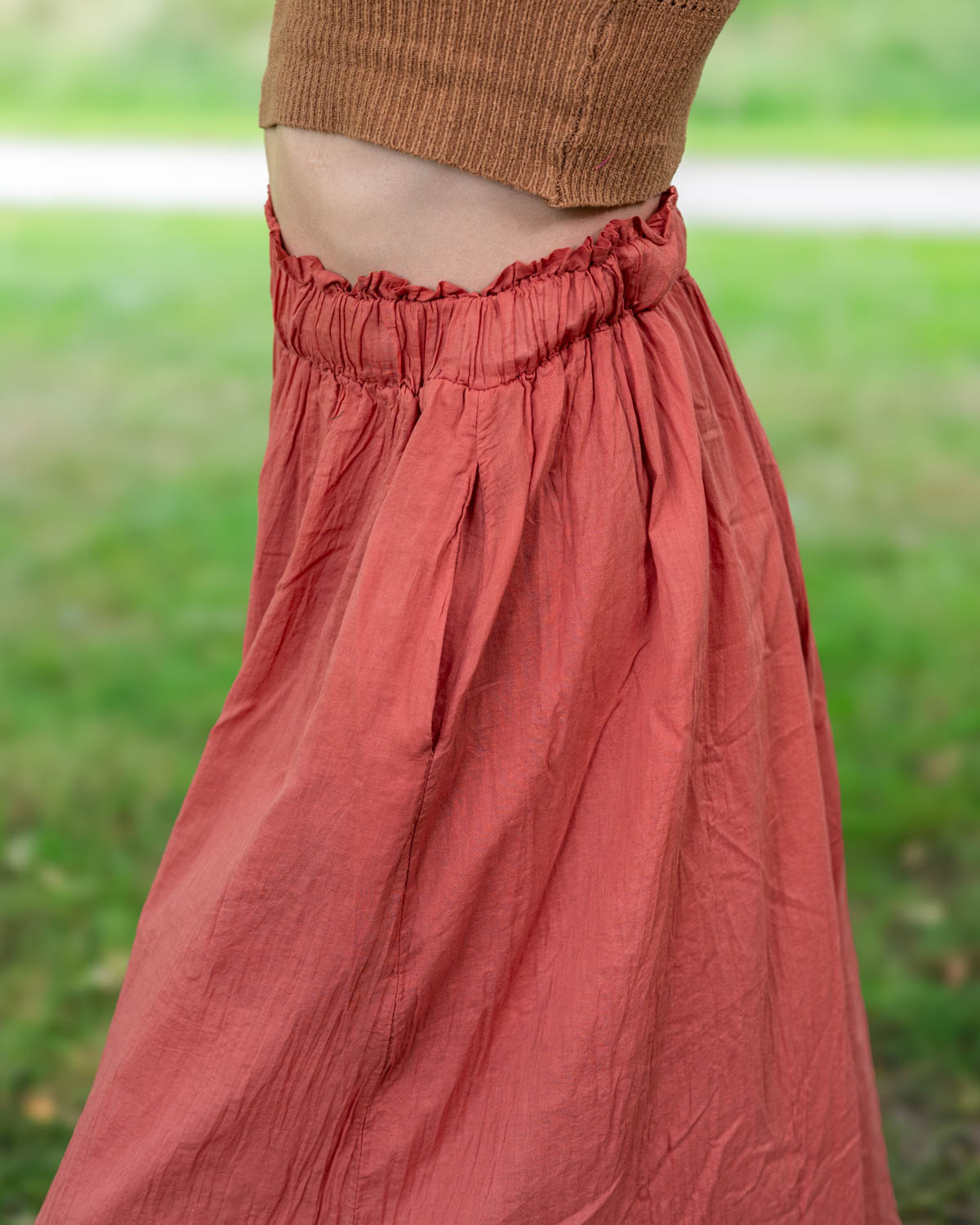 De elastische tailleband zorgt voor extra comfort en een mooie pasvorm rond de middel. Dankzij de voering schijnt de stof niet door, zodat je je altijd vrij kunt bewegen. De unieke oranje-roze kleur geeft elke outfit een warme, bohemian uitstraling.