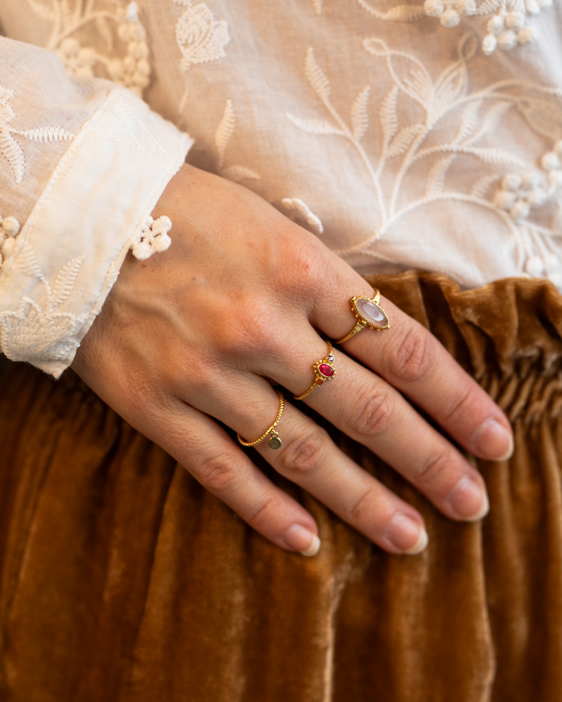De ring is met zorg vervaardigd en afgewerkt met een luxe verguld laagje, waardoor hij een warme, gouden gloed krijgt.