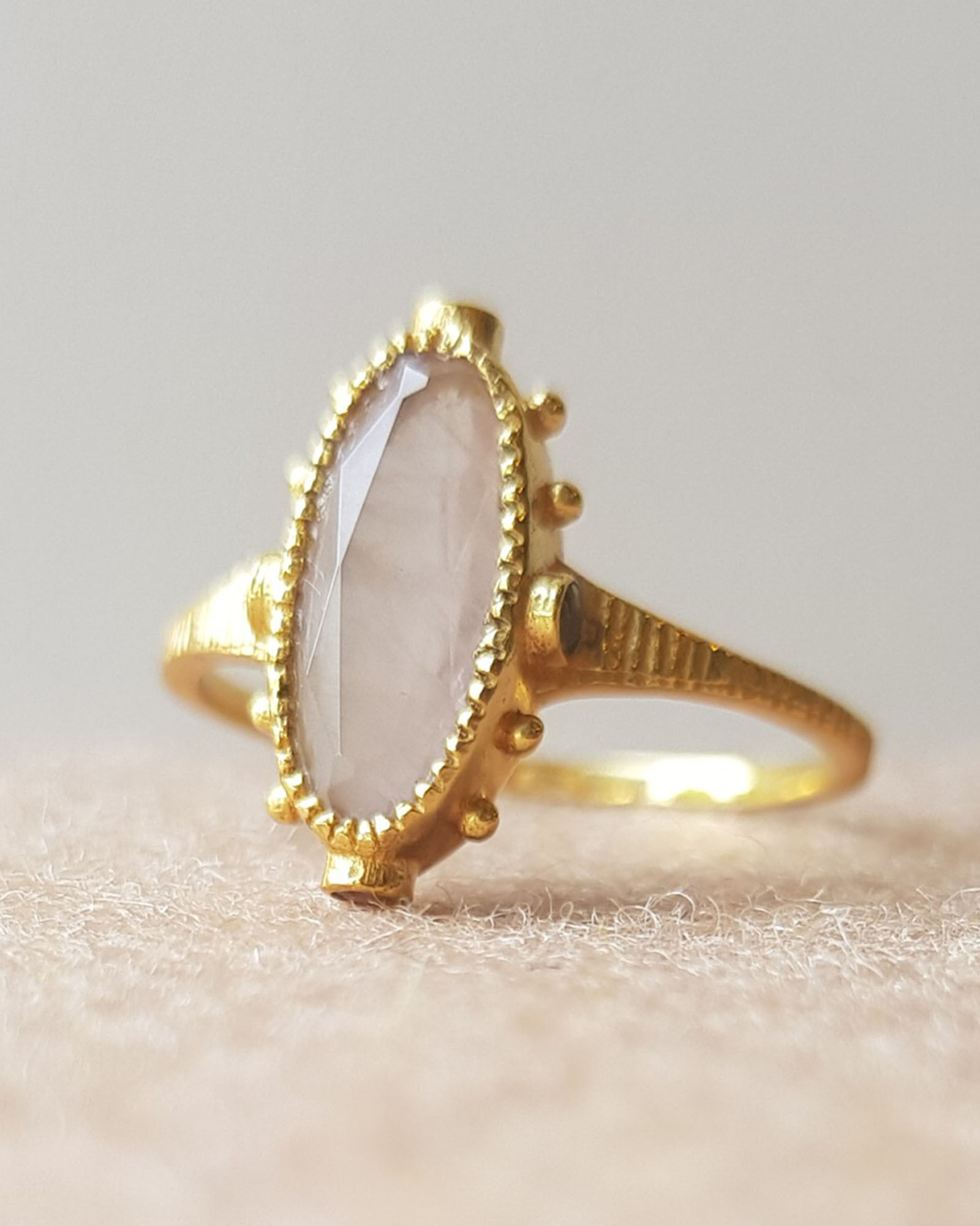 Voeg een vleugje verfijning toe aan je sieradencollectie met deze prachtige vergulde ring met rozenkwarts van Muja Juma. De ring is subtiel maar opvallend, met een elegante, ovale rozenkwarts steen van 5×12 mm die prachtig schittert in het licht.