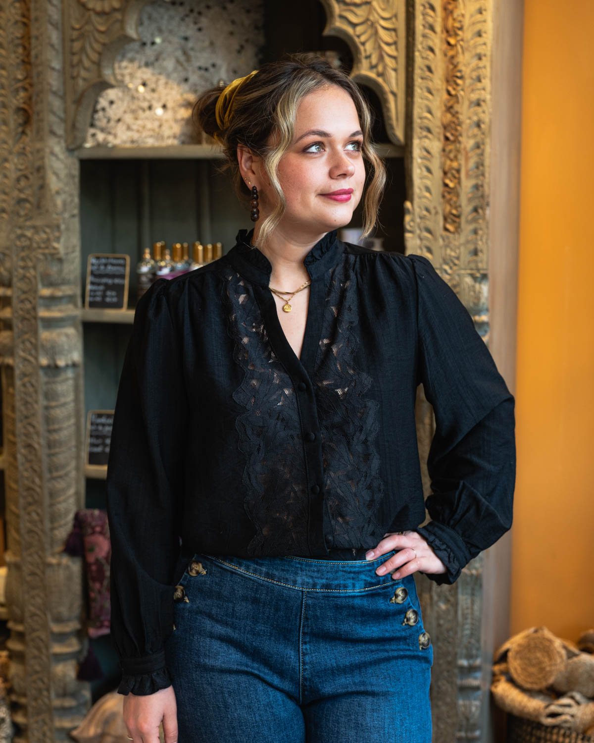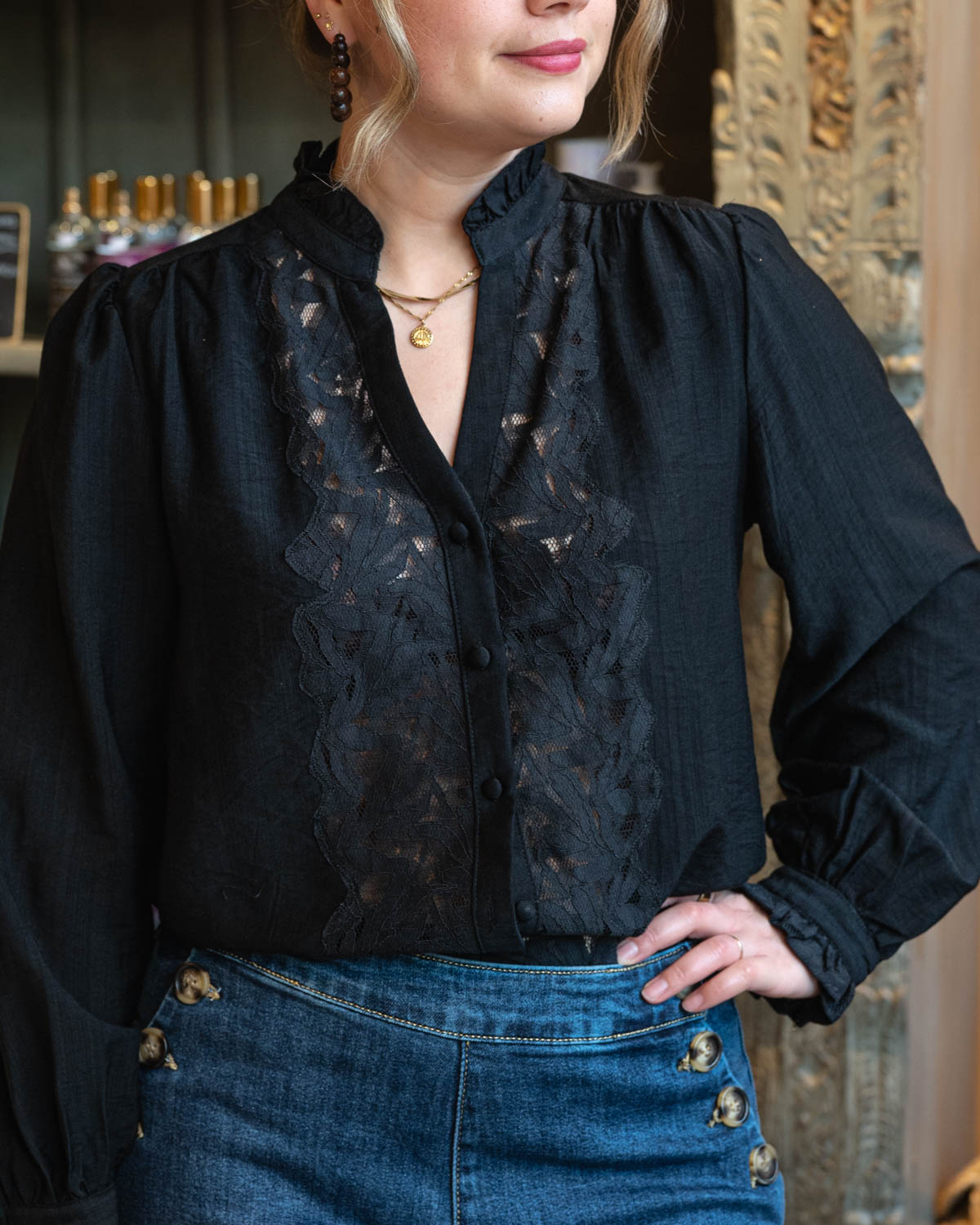 • Detail kant midden zwarte blouse Noémie
